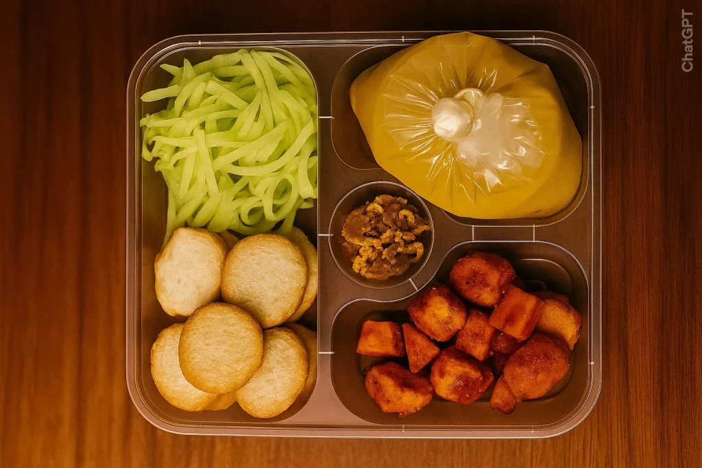 Lontong, Opor Ayam + Bawang Goreng, Sambal Goreng Tahu Kentang, Jipang Serut Kukus
