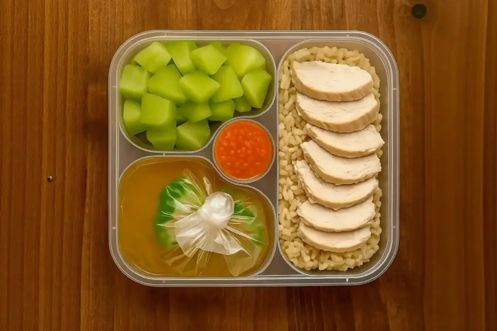 Nasi Hainan, Ayam kukus, Kuah labu siam, Sambal