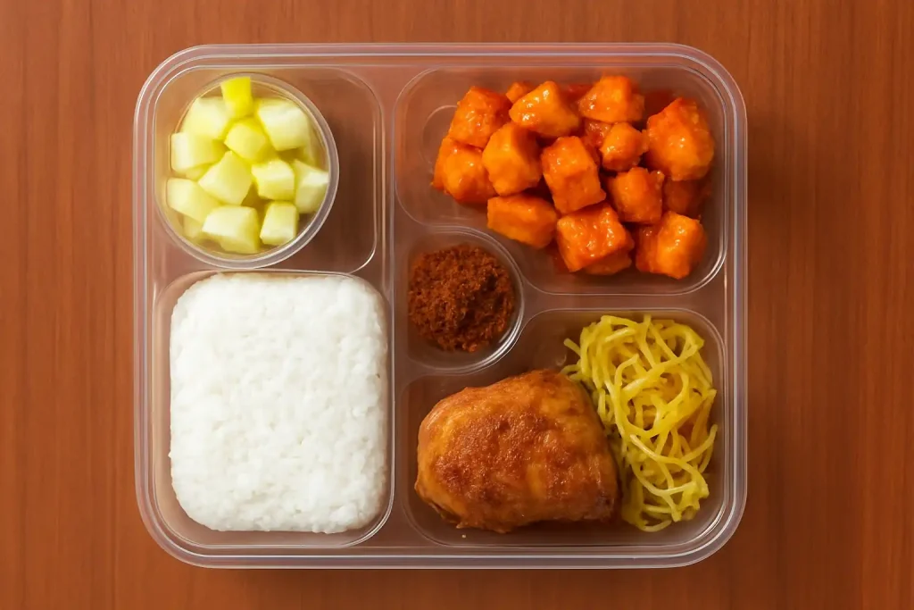 Nasi Uduk, Ayam Goreng Laos, Sambel Gr Tahu Kentang, Telur Dadar Iris, Acar Timun Nanas