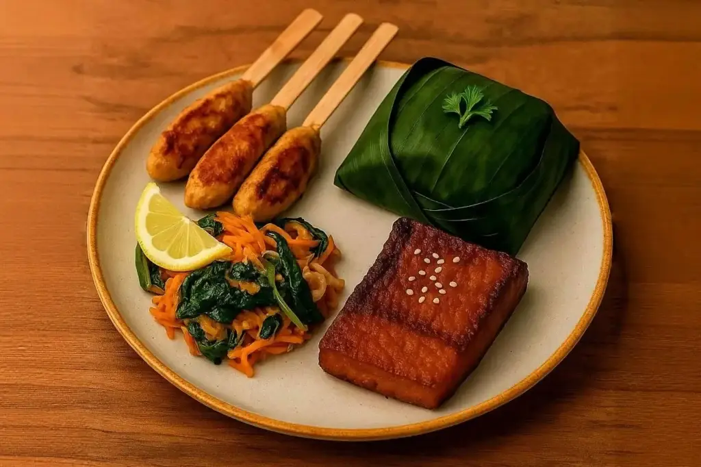 Nasi putih, Sate lilit ayam, Urap, Tahu bacem